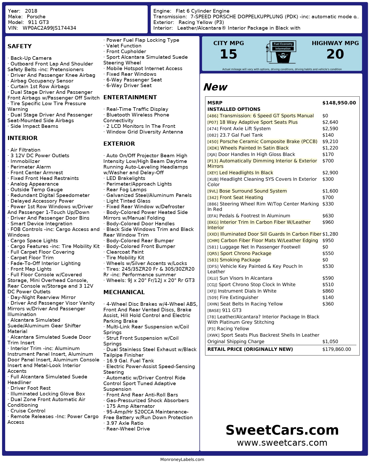 This GT3 is finished in Racing Yellow over a Black interior and factory options include: